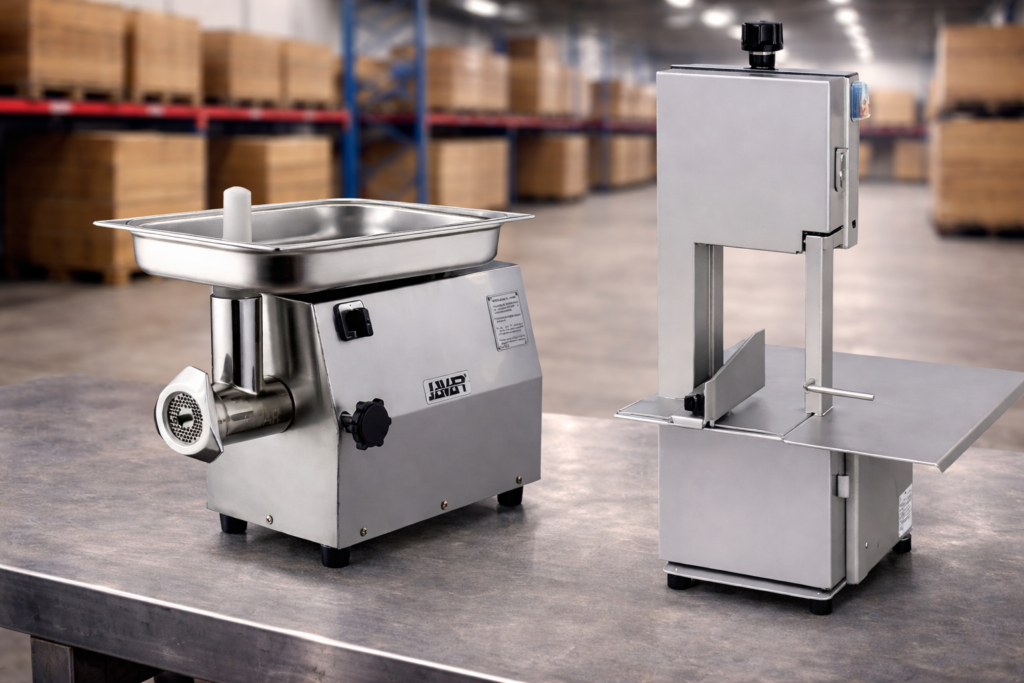Maquinaria para procesamiento de alimentos como moledoras de carne, sierras para carne y hueso y equipos de corte industrial. Fabricados en acero inoxidable, ofrecen precisión, higiene y alto rendimiento para carnicerías, supermercados y plantas de producción.